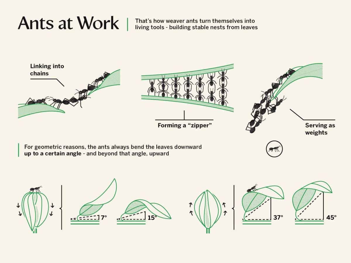The rainforests of northern Australia are home to extraordinary ant colonies. Instead of dwelling in underground burrows, these ants inhabit canopies of trees, dozens of meters above the ground, inside hollow spheres they construct from tree leaves. During the building process, the ants link their bodies together to form living tools, eventually weaving the leaves into nests using silk threads produced by their larvae – hence their name: weaver ants.