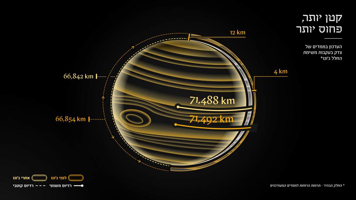 הממצאים החדשים מראים כי הממדים של צדק מעט צנועים יותר מכפי שהוערך בעבר – כוכב הלכת צר יותר בכ-8 קילומטרים באזור קו המשווה שלו ושטוח יותר בכ־24 קילומטר באזורי הקטבים. במלים אחרות, צורתו פחוסה יותר מכפי שסברו עד כה. "ספרי הלימוד יצטרכו להתעדכן", אומר פרופ' כספי. "צדק עצמו לא השתנה כמובן, אבל הדרך שבה אנו מודדים אותו – כן".